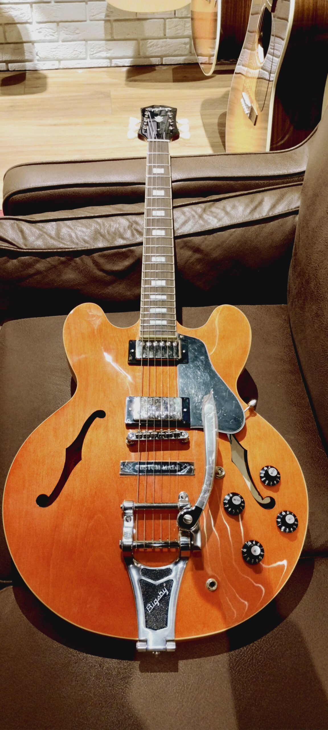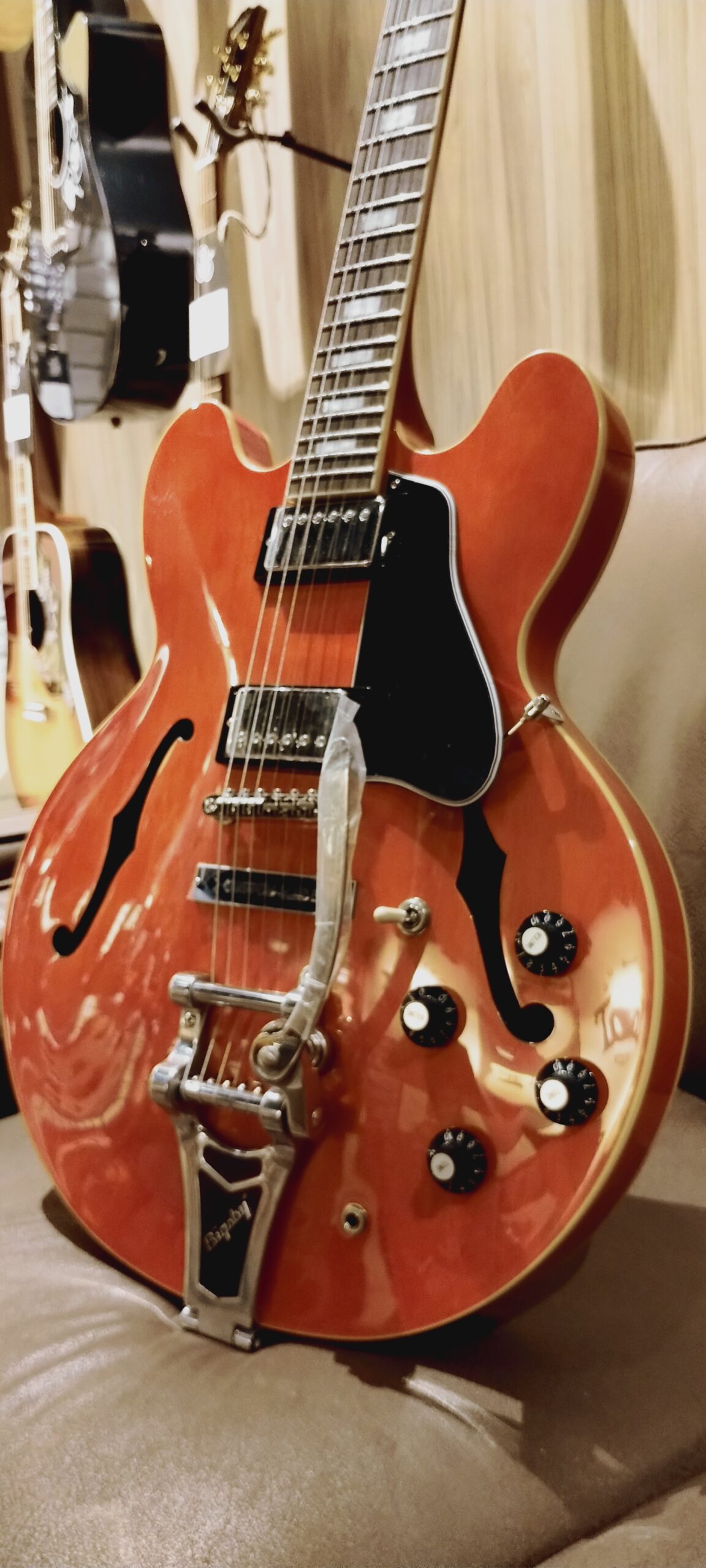 Uwagę zwracają mostek Bigsby oraz główka Kalamazoo, podkreślająca dziedzictwo tego modelu.
